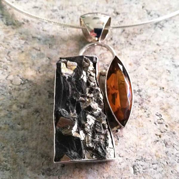 Pyrit Schiefer Anhänger mit Obsidian in 925 Silber